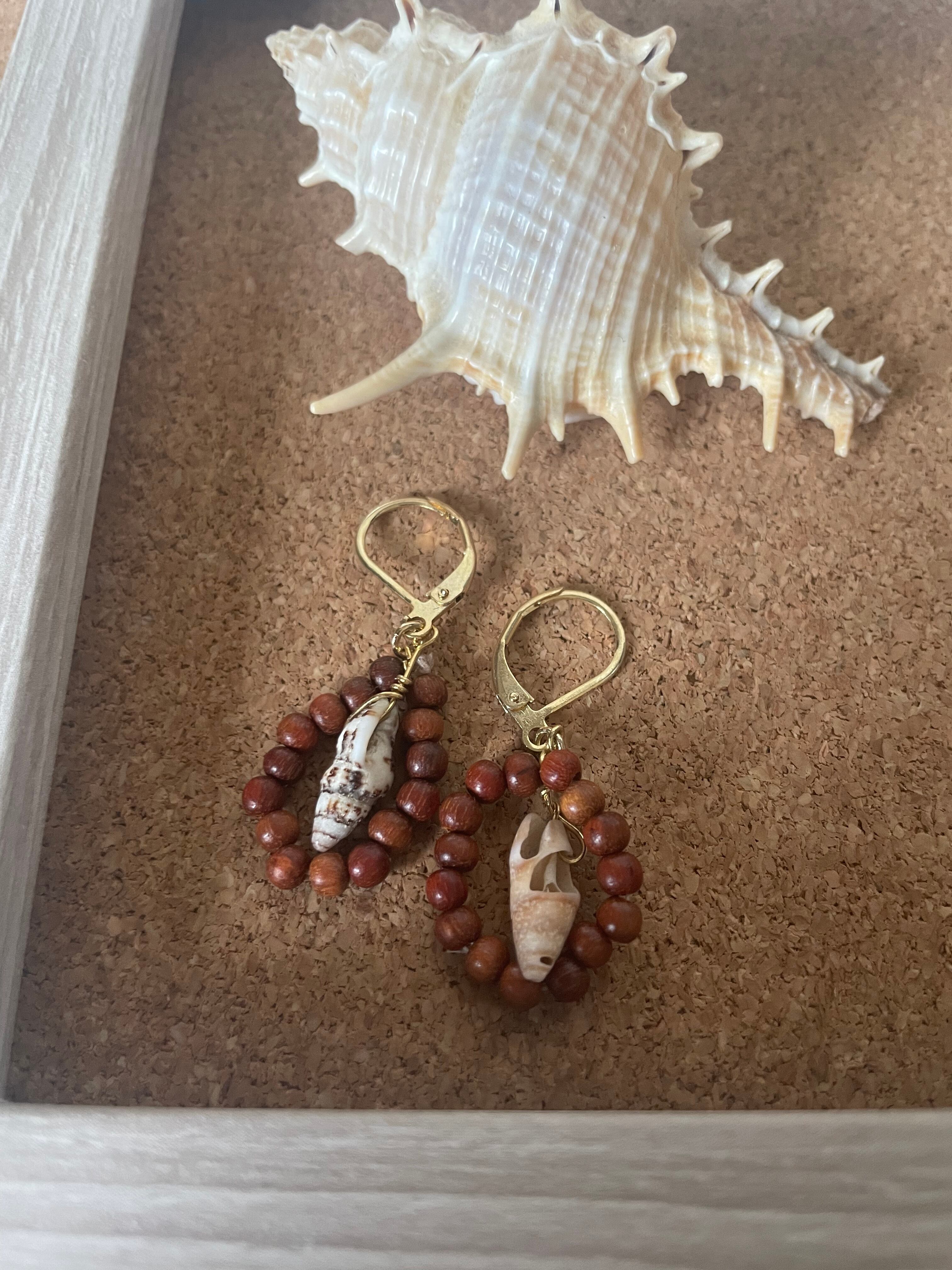 ウッドビーズと天然のシェルのピアスですo⁺‧•͙‧⁺